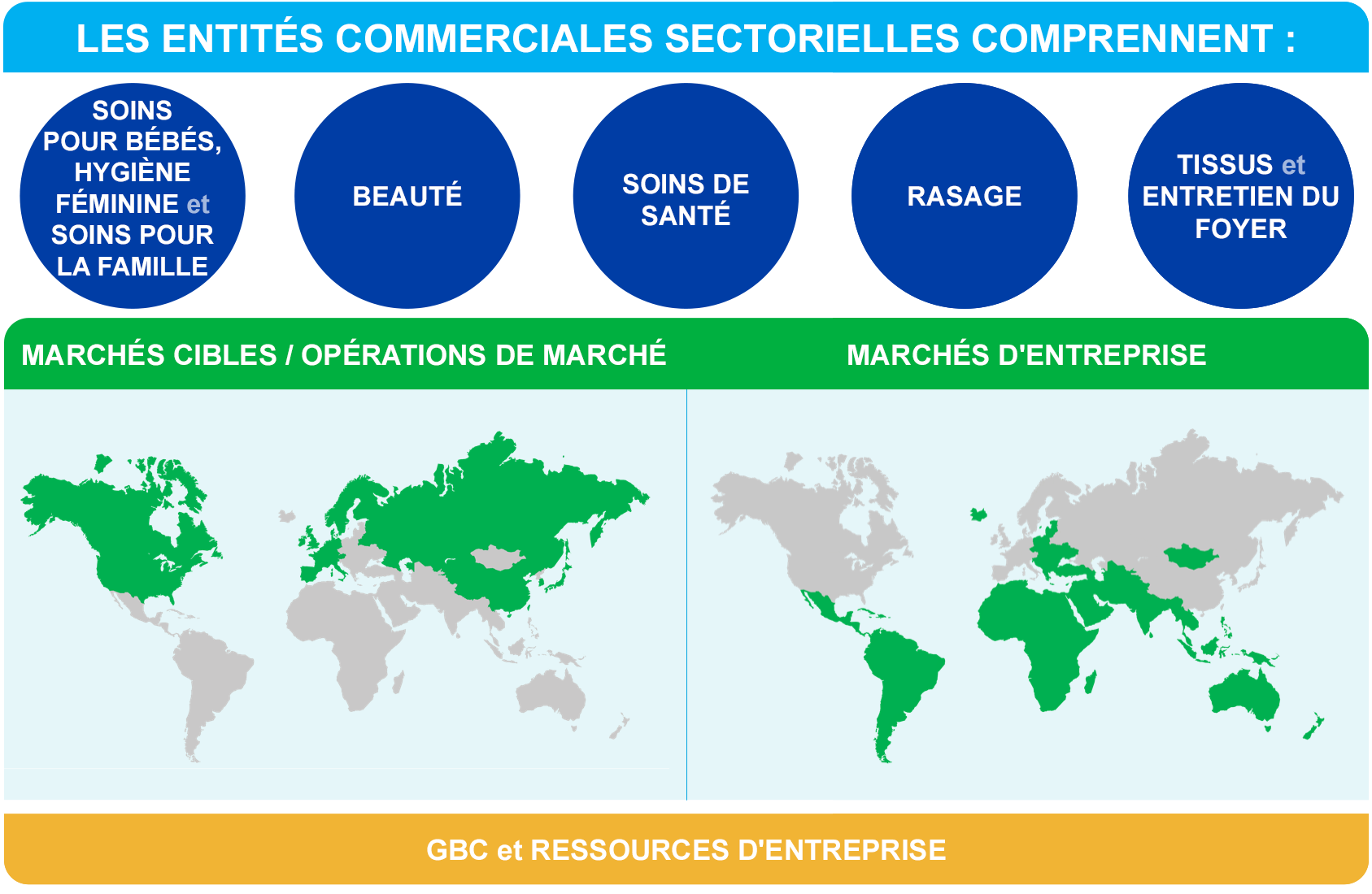 P&G opère par le biais de cinq entités commerciales sectorielles ou ECS basées sur l'industrie : soins pour bébé, hygiène féminine et soins pour la famille; beauté; soins de santé; rasage; et tissus et entretien du foyer. Nous gérons nos 10 catégories de produits au sein de ces ECS.